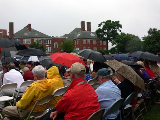 Alas, God was merely toying with us! As we hiked on down to the athletic field, the clouds rolled in. The students filed in at 6 p.m. and by 6:15, the rain was coming down and the headmaster was already desperately joking about this being just a passing shower. First, there was a performance of a lovely Dvorak string quartet by Eddie and friends, which we couldn't hear because of all the people around us complaining about the rain. Then there was the usual lengthy parade of speakers; ironically, they were all interesting and worth listening to and we all wished that the speakers would shut up and sit down. Andrew Katzenstein, in particular, gave a lovely riff about dreaming which we could barely hear. I kept thinking - surely they aren't going to keep going! This is madness! And indeed a couple of speakers started out by saying that they were going to spare us and post their complete address on the web, but, while they were here, they'd still like to make the following lengthy remarks...