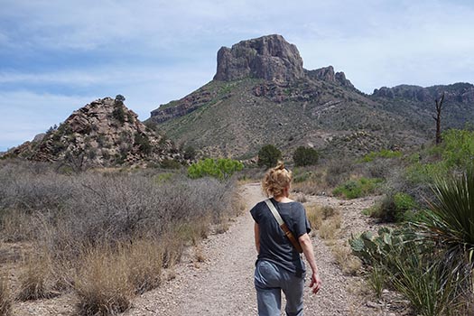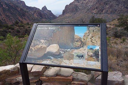 We entered the park around noon through Persimmon Gap and drove up the mountains to the Chisos basin. The basin contains a small hotel, with restaurant, a store and some housing units to rent. After a bite to eat in the restaurant, we decided to do one of the basin trails called 'window view trail', which is designated 'easy', to cater to my total lack of conditioning. The trailhead was a short stroll from where we were and we started down a pleasant gravel trail towards a break in the mountains called 'the window'. Pretty soon, we realized that we had been descending via a series of switchbacks and that we had already walked more than the promised one mile round trip. We turned around and slogged back up the trail that had turned steep, rough and unfriendly, muttering to ourselves about the unreliability of guidebooks. But when we got back to the trailhead, we noticed that we had been walking down the window trail, not the window view trail. The window view trail turned out to be on a level, smoothly surfaced, ADA-approved path to an overlook where the window was nicely displayed. I guess reading the trail signs isn't such a bad idea after all.