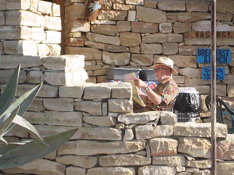 | On Monday morning, we head homewards. We take a more roundabout route than we did coming, going to Alpine where we buy a new tire; then past Davis State Park; then past the Macdonald Observatory and up to I-10. Louise proposes that we break our journey somewhere and get up early the next morning so I miss only a minimal amount of work time. I resist the idea until we get to Fredericksburg, where the sky turns black and it is obviously about to rain cats and dogs. We stop at a restaurant with its own brewery and on entering we discover that they also rent rooms. We sign up, quaff a few excellent brews, dine and go to bed. In the morning, we arise before the sun and Louise drives us back to Austin. |