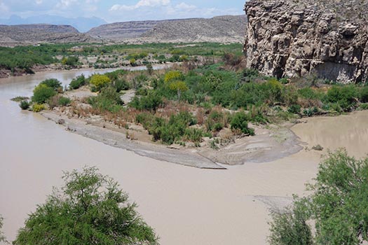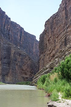 | And finally, at the end of the road - the Rio Grande. The river carries a lot of sand in suspension which gives it a startling green color. The canyon walls are high and normally this is a place for rafting but the river is too low right now. You can practically walk across to Mexico, which highlights the problems the US has in securing its border. The border patrol doesn't put in an appearance here, but if you drive out of the park in any direction, you will soon enough be pulled over for a quick peek in the car - more, I imagine, if you look hispanic. |
