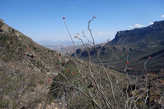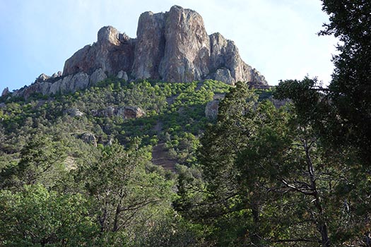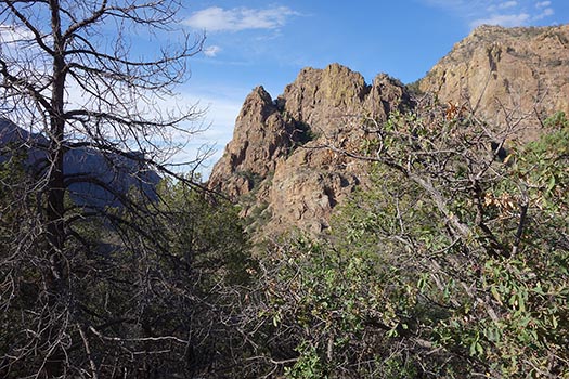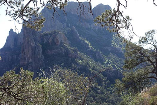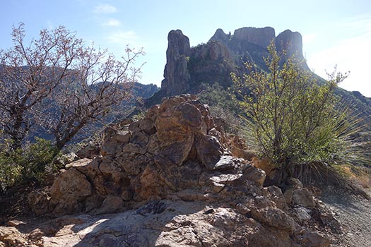 After our Mexican adventures, we return to the Chisos basin for an excellent local IPA. Thus fortified, we drive to the Lost Mine Trail, which is only a few minutes away and which is the most popular hike in the park. When we get there, there are surprisingly few cars. Louise decides to take a nap, so I go on alone. It is not a hard trail, but leads to some very dramatic views to the east and I am hoping that the sun will be low enough to cast some lovely light. (Actually, it turns out I'd have had to wait at least another hour for that.) I am greatly encouraged that my feeble body is able to carry me up the mountain. |