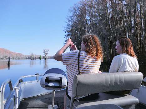 The next day we had booked a tour of the lake for nine o'clock, in order to avoid the heat, although none of the days we spent at the lake were unpleasantly hot. Our tour guide, Rich McFarlane, Jr., had spent much of his life at the lake and turned out to be a pleasant and knowledgeable guide. Our only disappointment was that we didn't see a lot of animal life, including no gators. One interesting nugget we learned was that Lady Bird Johnson (nee Claudia Taylor) grew up on the lake on an antebellum plantation house, which we were able to get a glimpse of in the distance. When it was possible to ship goods directly to New Orleans via the lake, the plantation owner was able to clear a passage to his property so that the steamers could pick up his products - mainly cotton. Other "digs" have been created in order to allow the traffic to move more efficiently over the lake.