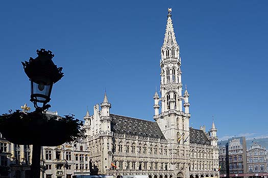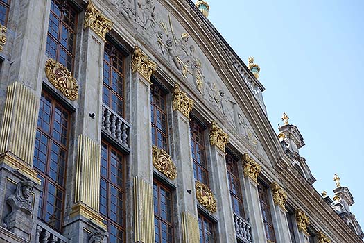 A few steps further took us into the main square, which contains a bunch of amazing buildings. There is the 15th century town hall, still in use, with its intricate ornamentations and spire. There are the guildhouses, featuring little caricatures of the activities of each guild. The palace, now an art museum. The buildings at the north end of the square were being renovated, so a huge screen had been erected in front of them decorated with a representation of what we were missing.