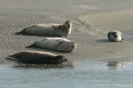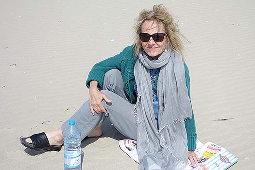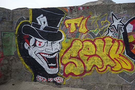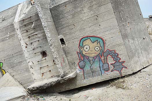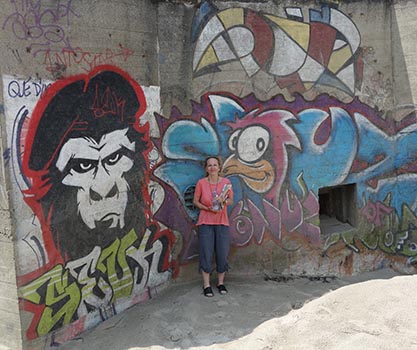 When we first went on the beach, we were astounded by how huge it is. Like Mont St. Michel, the beach has a very shallow slope; when the tide is out, the sea is so far out that you can hardly see it, but when the tide comes in, the water can come roaring up the beach at an alarming rate. It was quite sunny but windy and cool and we both had our woolies on. Our first stroll took us south, past a class in sand yachting (which looked like fun but a bit scary in all the wind), to the town esplanade. Beyond the esplanade was an inlet where there is a seal colony, which we inspected and which inspected us. The next day, we went north, where there were all kinds of cool German fortifications in an advanced state of decay and mostly covered with grafitti.