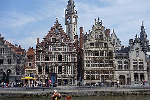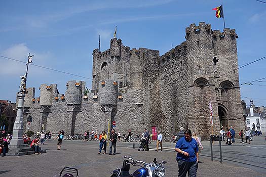 Off to Ghent the next day, which, like Bruges, has an amazing number of ancient buildings. Unlike Bruges, it was a thriving cloth manufacturing center for many years and all that industrial activity coated the ancient buildings with a thick layer of grime. It wasn't until the last century that the city decided to go for the tourist trade and scraped off all the grime. Now it competes with Bruges for the tourist dollar. It seems a little less crowded than Bruges, which appealed to us, and it has a kick-ass castle in the middle of everything.