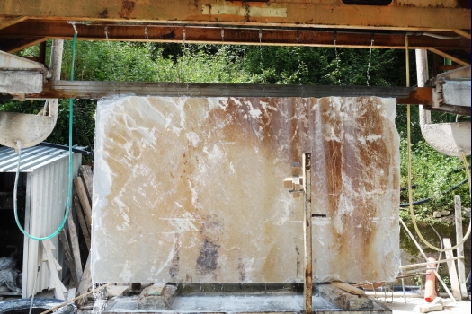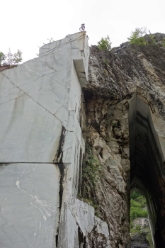 This area of Tuscany, although gorgeous, is not a huge tourist attraction. Instead, for many years, one of the main industries has been the extraction of marble from the mountains. At the beginning of the 16th century, Michelangelo was sent to develop the Tuscan marble deposit and spent several years supervising the building of roads so that the workers could get to the marble quarries and the blocks of marble could be transported off the mountain for further processing. The process of cutting the blocks of marble out of the mountain has evolved over the years and is now accomplished by setting up a network of pulleys over which a cable runs in a loop. The cable used to do the cutting by having sandy water constantly poured over it; it now has diamond cutters attached to it.