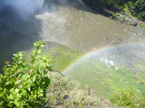 | Top of the falls | Rainbow | The falls in the mist | Louise on the trail to the base of the falls |