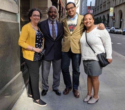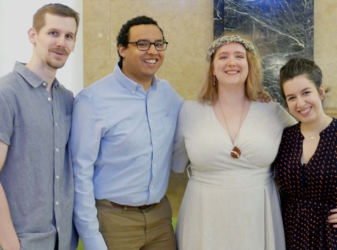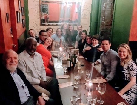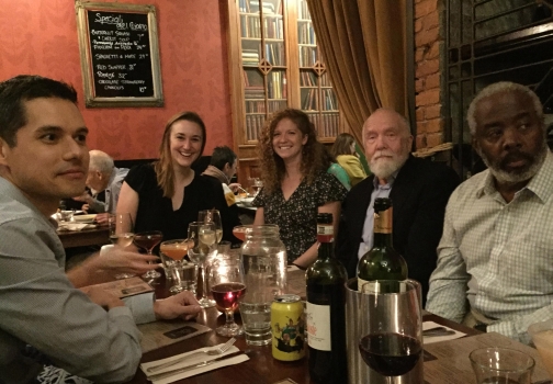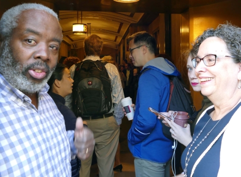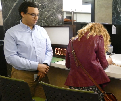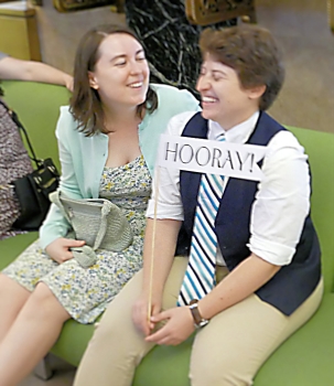 Louise and I had booked a room through AirBnB on 150th Street, a couple of blocks from Madeleine and Phil's apartment. We were happy that it was so close and quite inexpensive, although it was definitely not a luxury hotel. The entire bathroom would have fit in a small elevator, shower and all. Nevertheless, it served us well during our trip. We met with Madeleine and Phil on Friday morning and took a taxi down to city hall. We got there just before it opened and couples had been lining up on the sidewalk, eager to be spliced. It is there that we met Duane, Hannah and Rachel, along with some of Phil's friends. Entering city hall was not simple - we had to go through the metal detectors, past armed guards before we got to take a number for the ceremony. We then waited for quite a while before our number came up, providing an opportunity for photos to be taken. When our number did come up, it was just to take care of the paperwork and then we went to another room and waited some more. It reminded me of when I was applying for a green card back in the early 70ies - I would be ushered into a huge room stuffed to the gills with other immigrants, where I would spend about half the day waiting to be called. (That always reminded me of a line in the song "Summertime blues" - "Called my congressman and he sent a note: 'I'd like to help you son, but you're too young to vote.'") But I don't want to give the impression that the waiting on this occasion was a source of discontent - the cameras kept snapping and we were all too happy to notice the time pass.