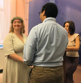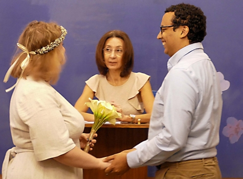 Finally, there was a quick, non-denominational ceremony. We filed into yet another room and Madeleine and Phil went up to a lectern, behind which was a smiling woman who asked the hard questions - "Do you, Phil/Madeleine, promise ..." They said yes, and it was official. Yea!