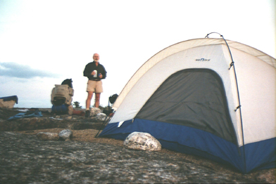 After lunch, we continue up the ridge, which gains quite a bit of altitude going up Mount Parker. We then have a long stretch of up and down, going towards Mount Resolution. Many of the trees are damaged, we are told, as a result of the great ice storm of 1997, which has also affected the path. Not only are there a lot of tree limbs obstructing the way but the undergrowth has also been invigorated by the increased sunlight, so that it is quite hard to see the trail. We have resolved to stop short of the summit on a scenic outlook that turns out to be gorgeous – 360 degree views, including a good shot of Mount Washington with the summit buildings visible on top. We pitch the tent up on top and, feeling pretty trashed after a long day’s hike, I soon turn in. I try to bring a cup of bourbon with me in the tent for medicinal purposes, but only succeed in spilling most of it over myself and my sleeping bag. Bobby, fortified by his week-long hiking in Washington state just a week ago, is made of sterner stuff and sits outside counting stars for a while before joining me in the tent.