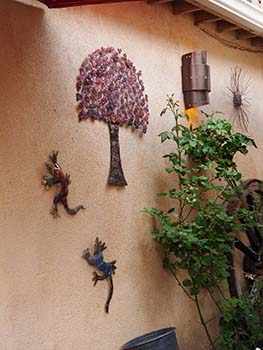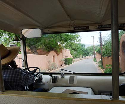 Back on the road Monday morning to drive to Santa Fe, stopping in Roswell despite Louise's dire warnings that we would be abducted by massive quantities of alien schlock. Sure enough, we couldn't resist buying a few trinkets inspired by UFOs and aliens, but we were soon back on the road and got to Santa Fe in time for a late lunch. After eating in the central plaza, we took a 90 minute tour in an open bus to get a leisurely introduction to the town, although Toni pronounced the driver/tourguide terminally boring. Later in the afternoon, we returned to the plaza and sat on a balcony and had a leisurely dinner, although Louise pronounced her chili terminally revolting. Santa Fe had a bit of the feeling of a Disney creation from Epcot. All of the recently built houses and stores in the city have to conform with the short, earthen-hued adobe style prescribed by code. My goodness! - could all these structures date back to pre-columbian days and could they be inhabited by members of friendly native tribes? No. But, like Epcot, it is interesting and quaint and unfamiliar to tourists, and so keeps them coming back.