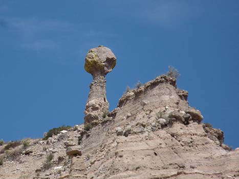 The area owes its remarkable geology to layers of volcanic rock and ash deposited by pyroclastic flow from a volcanic explosion within the Jemez Volcanic Field that occurred 6 to 7 million years ago. Over time, weathering and erosion of these layers has created canyons and tent rocks. The tent rocks themselves are cones of soft pumice and tuff beneath harder caprocks, and vary in height from a few feet to 90 feet.
