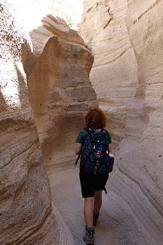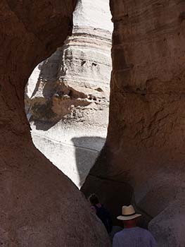 Well, dogs are definitely the losers. We passed through a slot canyon, which was spectacular and which also provided some much-needed shade. Then the trail headed up until we were on a level with the tent rocks themselves. I had to be helped up parts of the trail, but it was definitely worth it (for me, anyway.)