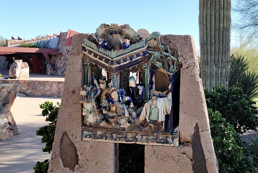 Another wonder of Scottsdale is Taliesin West, the winter home of Frank Lloyd-Wright. It is (of course) in a perfectly picturesque spot, somewhat off the road, so it took us a while to find it. Unfortunately, though it is possible to go through the house, the tour is rather expensive and must be reserved in advance. We contented ourselves with prowling around the parking lot trying to look like we were about to find our tour. We were not able to get very close to the house, but we got a few photos.