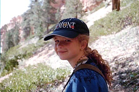 Saturday, August 18: With some trepidation, I propose a hike in the morning. Louise adds a clever spin – namely, that the girls get to choose the trail, so that they can’t complain if they don’t like it. The girls pick Navajo Loop – an excellent choice that can be completed in a couple of hours in a leisurely fashion. It goes down below the rim but is much less crowded than Bright Angel at the GC and the sights are more strange, though perhaps less Grand. After our hike, we have lunch at Lodge and then go on a drive through the rest of the Park. The drive is pleasant, but we encounter a thunderstorm which restricts our sight-seeing. After dinner, we go to see another colorful remnant of America’s past – a rodeo (put on by Ruby, of course). The riders are mostly kids, with only a couple of real cowboys among them. When it gets to the calf-roping, Madeleine suddenly becomes dreadfully offended and pronounces the whole thing to be animal abuse and we leave.