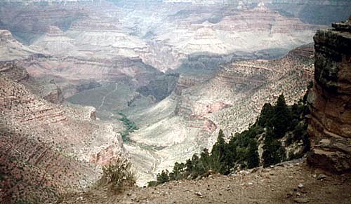Wednesday, August 8: Back to the Park, where we diddle around a bit before parking near El Tovar Lodge. I have ruled that the only way to experience the true delights of the GC is to get away from the Rim Trail, where all the tourists are, to the trails that dip below the rim and head towards the mighty Colorado. We walk along the Rim Trail to Bright Angel Trail, then down the trail into the GC for about 1 ½ mile to a rest-stop where we lunch and return, the mighty Colorado being nowhere in sight. It seems that most tourists have had the same insight and the trail is still quite crowded as well as being somewhat steep and dangerous and filled with mule poop. When we turn around, the going gets hotter and harder and tempers fray – no-one is speaking to me by the time we get back to the top. To improve the morale of the troops, I hurriedly organize an expedition to check out the El Tovar gift shop – and who do we see there but Sir Paul, former Beatle!!! He works the crowd very skillfully, chats with adoring fans, and sings happy birthday to 6-yr old girl. Boy, will she have something to tell her grandchildren! I try to avoid bothering him but Louise misses him altogether and is pissed off with me for not summoning her. We dine at El Tovar – it rains hard outside but the food is good and I am forgiven. And so to bed.