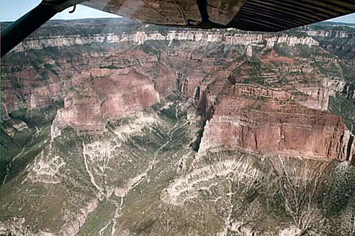 Friday, August 10: First, we pack up our stuff then off to GC airport (which is small, although there are a zillion small planes and helicopters in the air at all times), then into small Cessna for a 50 minute ride, which is sensational. It is just the four of us and the pilot, whose name is Tony the pilot, to distinguish him from Toni the passenger. There is a canned audio program on the headphones, complete with portentous music, but the perspective on the GC is unbeatable. (Later, we hear that a tourist helicopter crashed that same day and killed almost everyone on board which gives us a new perspective on aerial tourism.)