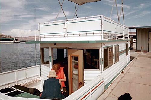 Monday, August 13: The night turns out to be a rare one – it rains a couple of inches of rain and is still raining when we meet Dave at the boatyard. We confess that we have no faith in the houseboat and would rather do some day trips on the lake on a power boat. Dave offers us the Sea Swirl, a little (highly reliable – guaranteed!) runabout we can buzz around on, see the sights and go water-skiing. We decide that we don’t want to do anything like that in the rain, but maybe tomorrow? Dave also offers the use of a huge houseboat that is sitting in the boatyard – he has sold most weeks on the boat as interval ownership but it is not in use for the current week. This will save us having to hunt down hotel rooms and save Dave from having to pay us for them. So we end up spending days on a houseboat, not going anywhere. It is a decent setup – good size bunks, fridge, propane stove, bathroom with shower – but it gradually becomes clear to us that nothing works quite the way we would like it to. There are some regular electric appliances such as a TV, Mr. Coffee, microwave and so on, but we are currently on battery power, which is 12 volts DC, so none of them work. The fresh water tank is empty and the only way to get drinking water is to descend the ladder to the ground, go over to a faucet in the ground and fill up a pot. The toilet and sink work off lake water, which is normally pumped in from the lake, but which is now being pumped out of a bucket. The bucket has to be refilled periodically from a hose connected to the faucet in the ground and the pump uses too much battery power to be left on all the time. The light switches are too high for the girls to reach, so the lights tend to be left on all the time. Then the batteries run down and the refrigerator goes off and our meat spoils. It is also too hot in the bunks and too cold on the upper deck. But, hey! who’s complaining?