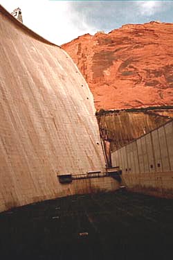 When we return, we check out and head for Page, which takes us all the way down the East rim drive (most of which is still open to private cars), stopping occasionally for assorted awe-inspiring sights. Much of the drive to Page is through the Navajo res which looks very benighted and poor, although there is also some really wild scenery and we also witness a couple of violent storms featuring some truly bizarre rainbows. One of these is kind of a rain stump – a multi-colored glow at the horizon, not extending any way up into the sky. Weird!