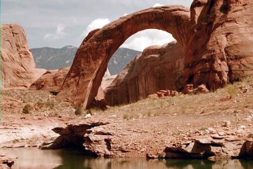 Tuesday, August 14: After a reasonable night on the houseboat, we pile into Dave’s truck again with the Sea Swirl in tow and head for Antelope Point. The weather is now back to Page standard deep blue sky and balmy breezes. Louise backs the trailer into the water, the boat’s engine starts first time and we are soon neatly tied up at the dock. I park the truck in the lot, return to the boat and we are off for our adventure. To our amazement, everything seems to work fine. The boat starts up every time and we find that, armed with a handy nautical map of the lake we obtained at the Dam gift shop, we can actually find our way around the lake with only a minimum of missteps. We zip up the lake at a respectable speed, stop for a swim and then again for lunch. We pass Dangling Rope marina and turn down the canyon towards Rainbow Bridge. The canyon itself is amazing – quite narrow, with almost vertical red rock walls. At the end is Rainbow Bridge – the biggest natural rock bridge in the world, standing nearly 300 feet high and wide. Excellent!
