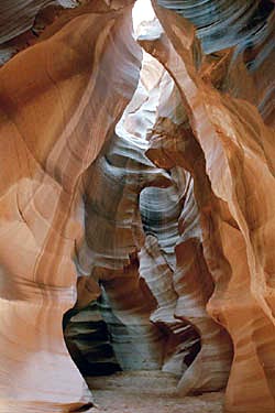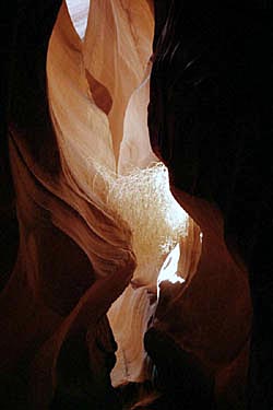 Wednesday, August 15: Louise is feeling a bit sun-burned and we decide it would be nice to stay away from the lake for another day. So we pile into town, buy some useless trinkets and sign up for a tour of Antelope Canyon. This involves taking a Jeep to the res near Antelope Point, paying another fee to the Navajo, and bumping along to the Canyon, which is also called Corkscrew Canyon. It is a slot canyon, with only a small crack at the top but opened up into fantastic shapes lower down by years of work by the wind and the rain. (On Monday, they had closed the Canyon because of the danger of flash floods – they lost a pretty large party to a flash flood some years ago.) Very dramatic and photographable.