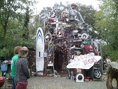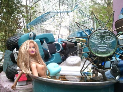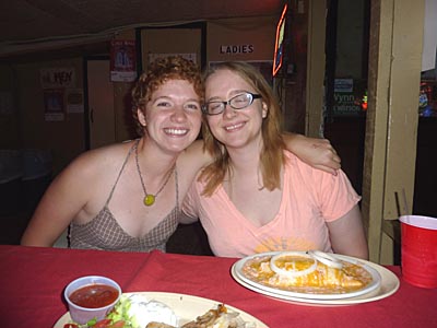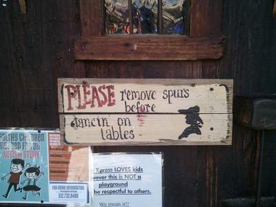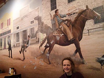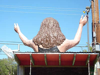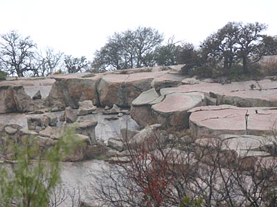 We then continued into Fredericksberg and checked into our hotel. There's a lot of Christmas hooplah in Fredericksberg, although the main attraction, which is a bunch of vendors selling Christmas trinkets on the town square, had closed by the time we got there. The next morning, we tried to have a quiet cup of coffee, although you can see in the top left-hand picture that Louise was caught in the middle of a bank hold-up that lead to a shoot-up. (Happens all the time.) The weather was back to chilly and rainy, so we headed north, towards Llano, stopping at Enchanted Rock on the way. This is a large pink granite outcrop now surrounded by state park. Had the weather been more enticing, we might have done a little hike, but we just stopped for pictures and got on our way. In Llano, we had strict instructions from our friend Eric Travis to visit Coopers barbeque, which turned out to be an amazing experience. Yes, the food was excellent, but it is more the concept of the place that is so fascinating. You line up outside at the pit to select your meat. Then you take it inside, add side dishes and pay for it. (Here we overheard one of the staff whispering to another - it's their first time here, so make sure you take care of them.) Then you go to the dining room, which has great long tables with benches. On the tables, at strategic intervals, are: rolls of paper towels, buckets of pickles, loaves of Wonderbread, condiments and tubs of baked beans. On the walls, stuffed animals. (But real ones.) |
