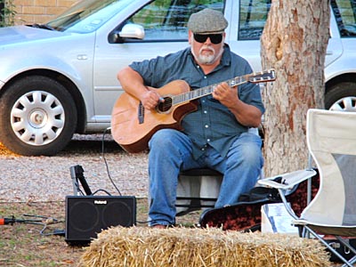 | For Louise's birthday weekend in early December, we drove west, through the hill country. Although it was cloudy to begin with, the weather cleared up just as we were getting to a string of wineries, just short of Fredericksberg. We decided to visit one of them, Grape Creek, and had a delightful time. There was a large lawn outside the visitors' center with tables and chairs for your picnic and views to die for. There was live music (of course) and we ended up buying a couple of quite respectable bottles of Petite Syrah.